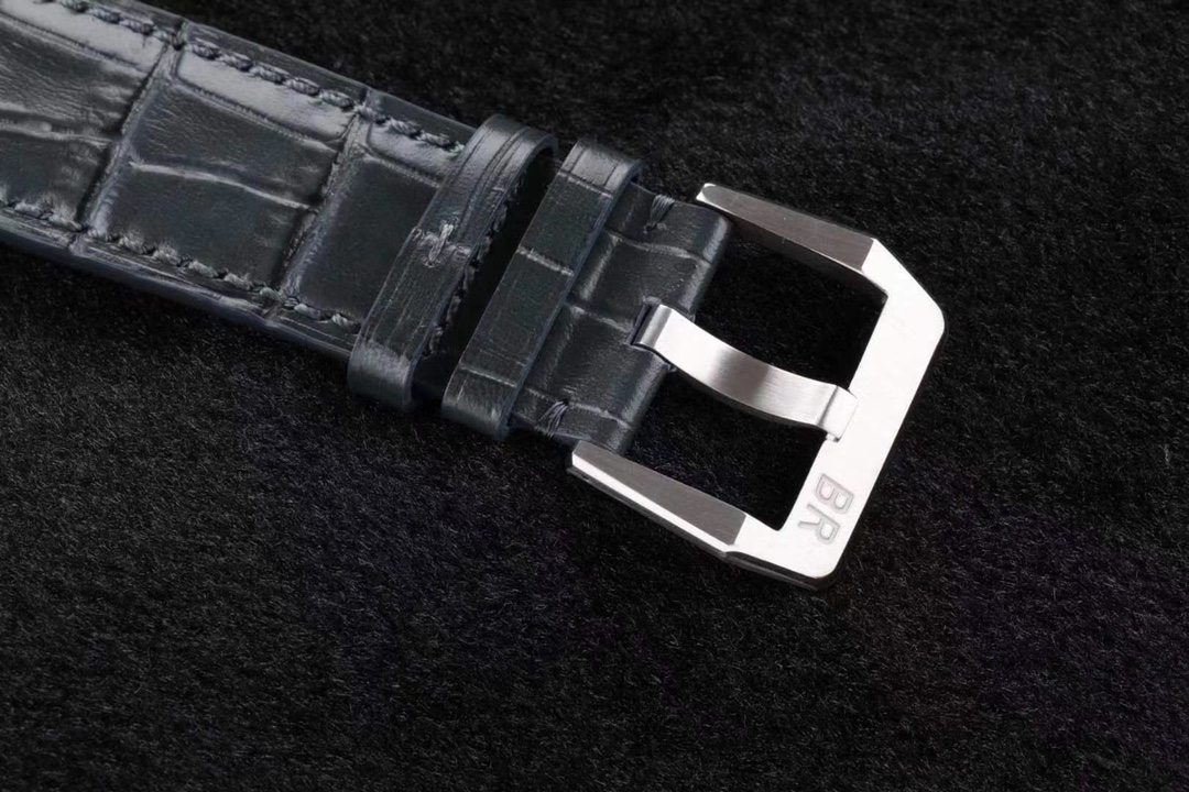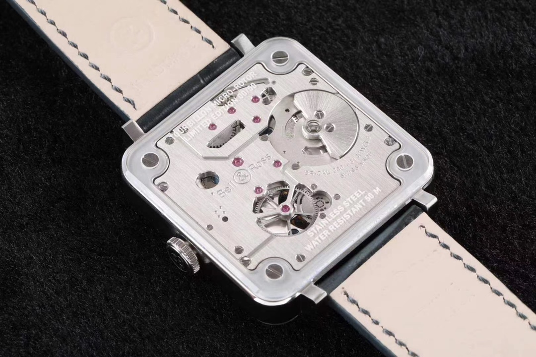 • The square BR-CAL.380 caliber is suspended between two sapphire plates, giving the illusion of a floating movement.