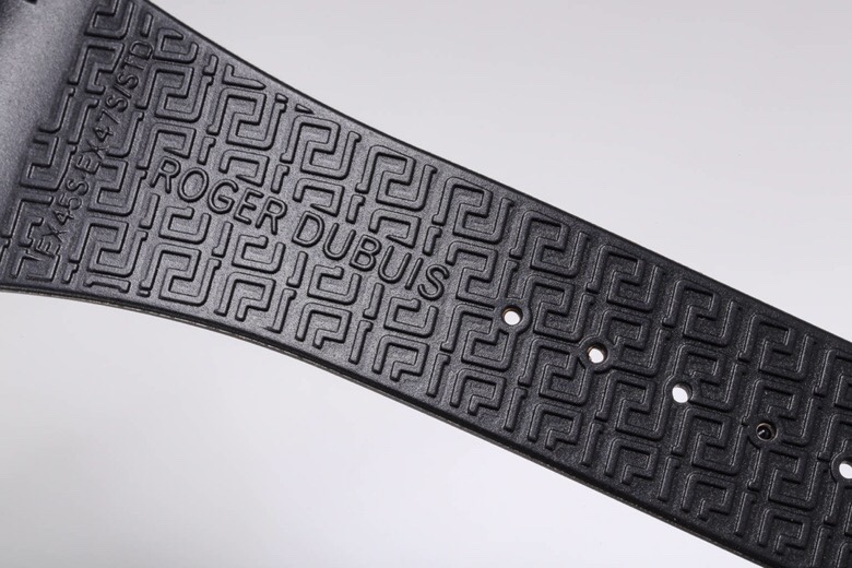 • Skeleton dial with luminous markers, black DLC-coated seconds subdial with RD logo
